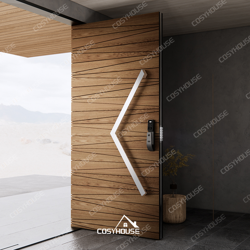 Crafted with premium wood veneer, the angled panel arrangement adds movement, depth and a strong sculptural presence to the door surface. The pivot opening system ensures smooth and stable operation, making it suitable for oversized door panels and contemporary architectural entrances.