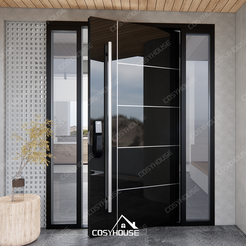 Cosyhouse offers full customization options, including door size, glass specification, aluminum profile finish, strip layout, pivot hardware system and lock configuration. Each aluminum pivot door is manufactured under strict quality control to ensure performance, durability and aesthetic precision.